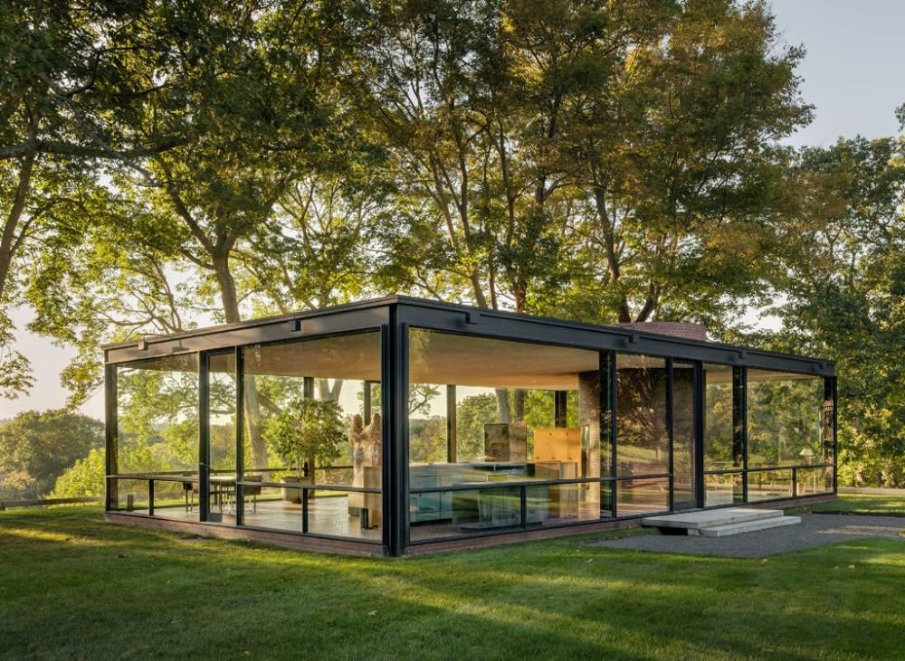 One famous example of a mid-century modern home is the Philip Johnson Glass House in New Canaan, Connecticut. Designed by architect Philip Johnson in 1949, he planned to live in the home himself. The home sits on 47 acres overlooking a nearby pond and is currently owned and managed by the National Trust for Historic Preservation. The interior space is decorated with low-hanging walnut cabinets.