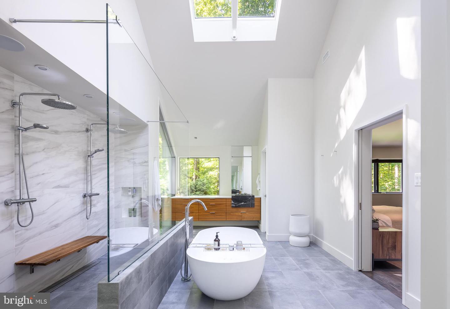 Positioned atop an expertly landscaped, 1-acre lot, this home - with complete renovation by Sagatov Homes in 2019 - espouses some of the most prominent ideals of modernism - simplicity, cohesiveness and purposeful orientation that pays homage to the natural surroundings. Uncompromising attention to detail is evident throughout. Soaring windows frame the tall trees and lush greenery, inciting a sense of excitement from the moment you step foot inside. The kitchen is light and welcoming. It features a large center island, parallel to the sizable window that overlooks the backyard, and an impressive array of high-end appliances purposely hidden in plain sight. The dual-sided fireplace creates an elegant divider between the kitchen and family room without closing off either space. Across the main level is a lively entertaining area that features a sleek and sophisticated bar, a climate-controlled wine room and a dining area with a beautiful gas fireplace. The primary bedroom on the upper level features a fireplace with gorgeous board and batten surround. The en-suite bathroom is vastly impressive, with heated floors, a dual-head shower, jet-soaking tub, separate vanities and separate water closets. A massive walk-in closet, a laundry room, three guestrooms and a guest bathroom complete the upper-level. The lower-level features an art-studio, a rec area perfect for lounging or playing games, a gym with direct outdoor access and lots of storage. An outdoor dining area off the kitchen with built-in grills as well as an oversized deck make for the perfect areas to unwind. This is an incredible offering of which our market seldom sees - a true modern home.