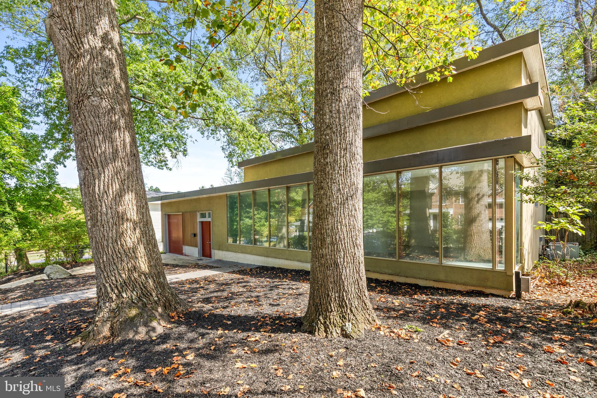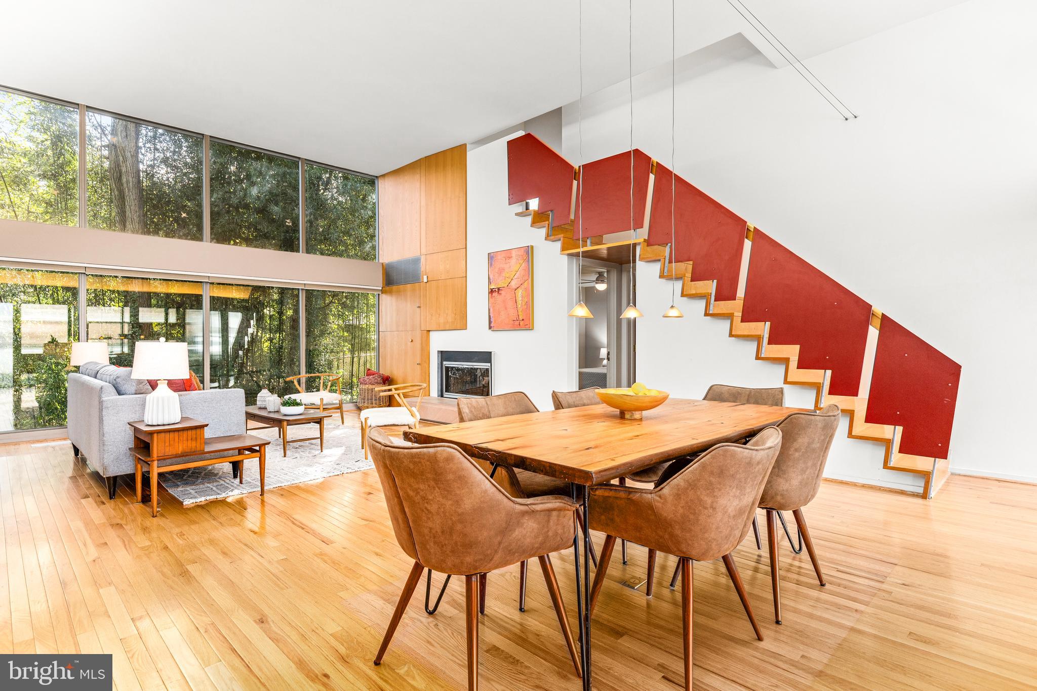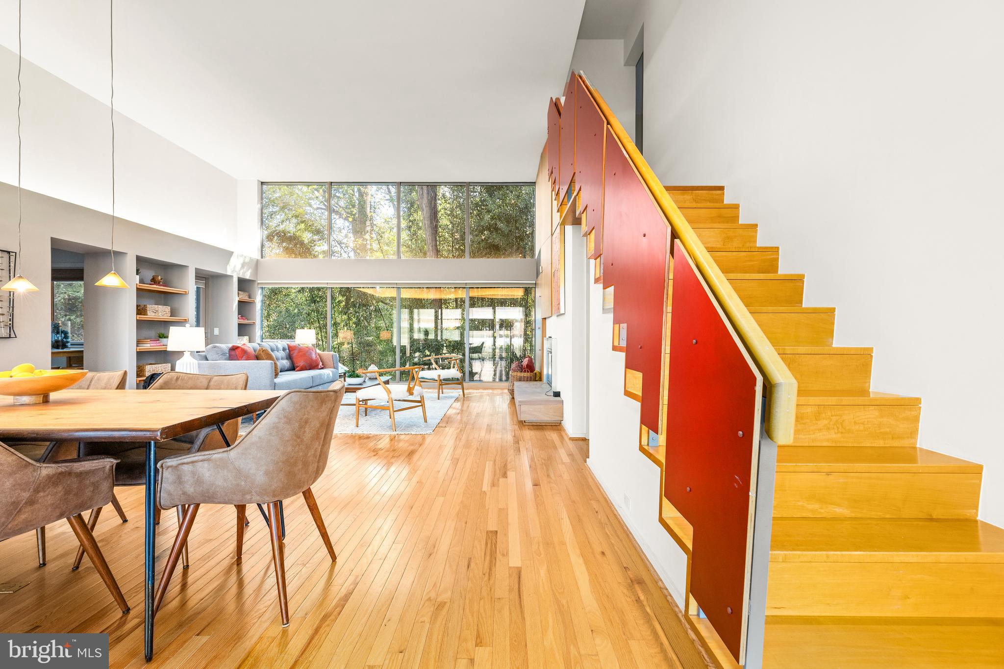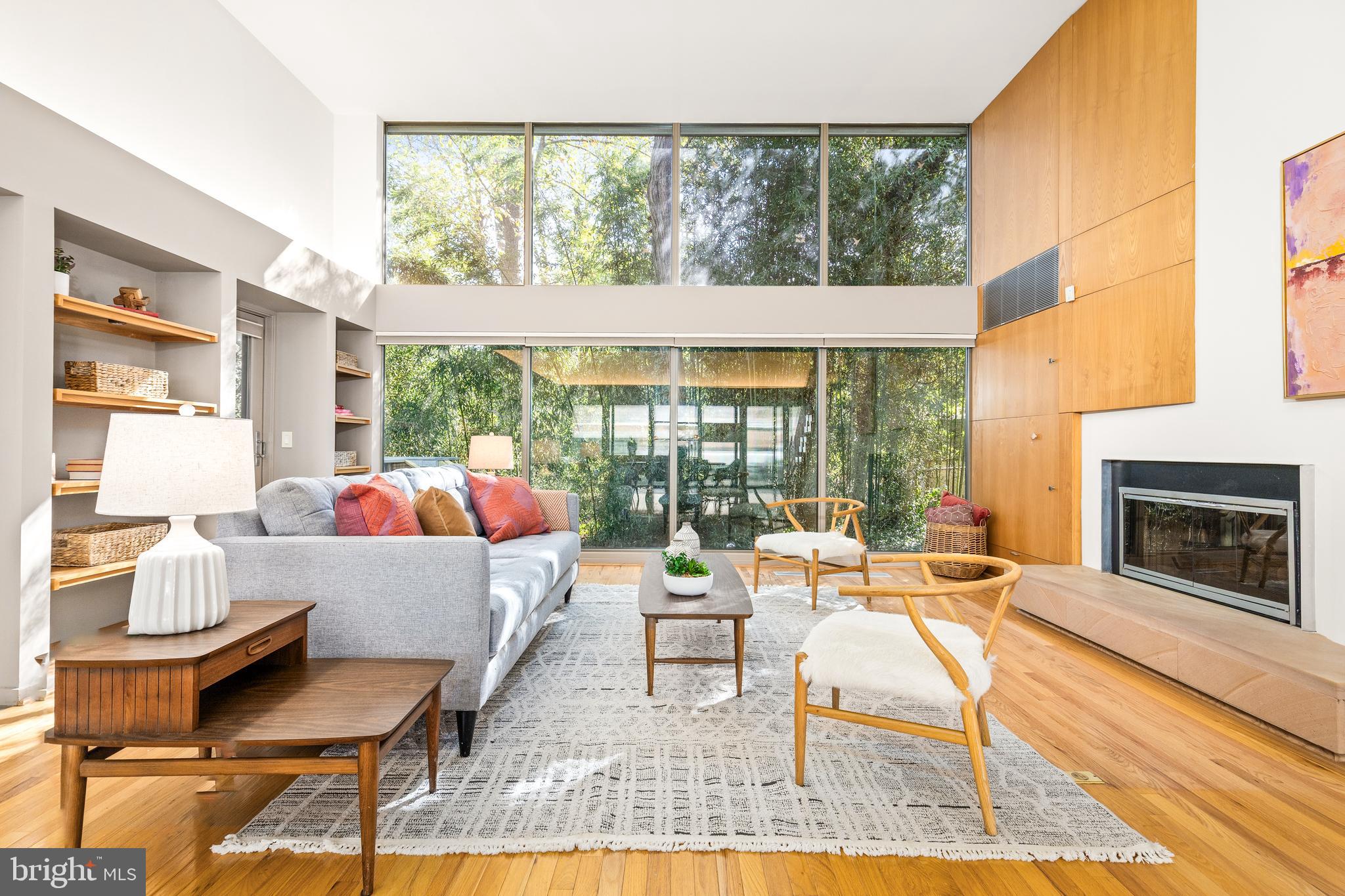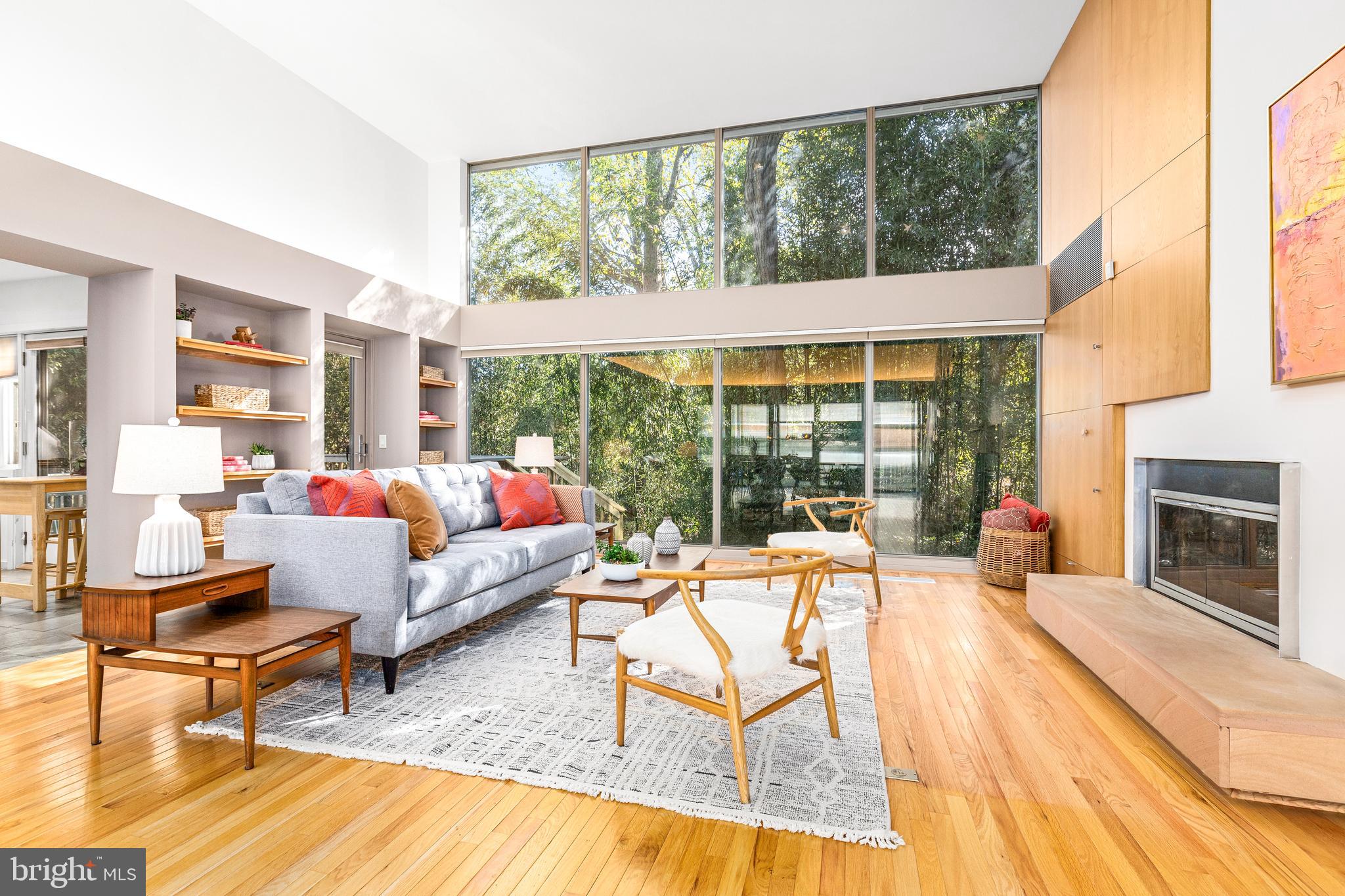 Set on an elevated lot in the City of Rockville, the home retreats gracefully from the street beneath a canopy of mature trees. A dense bamboo screen wraps the backyard, forming a secluded sanctuary of dappled light and privacy. Echoes of mid-century modernism are present, yet the architecture is distinctly of its own time, centered around a soaring two-story volume that defines the home's living core.