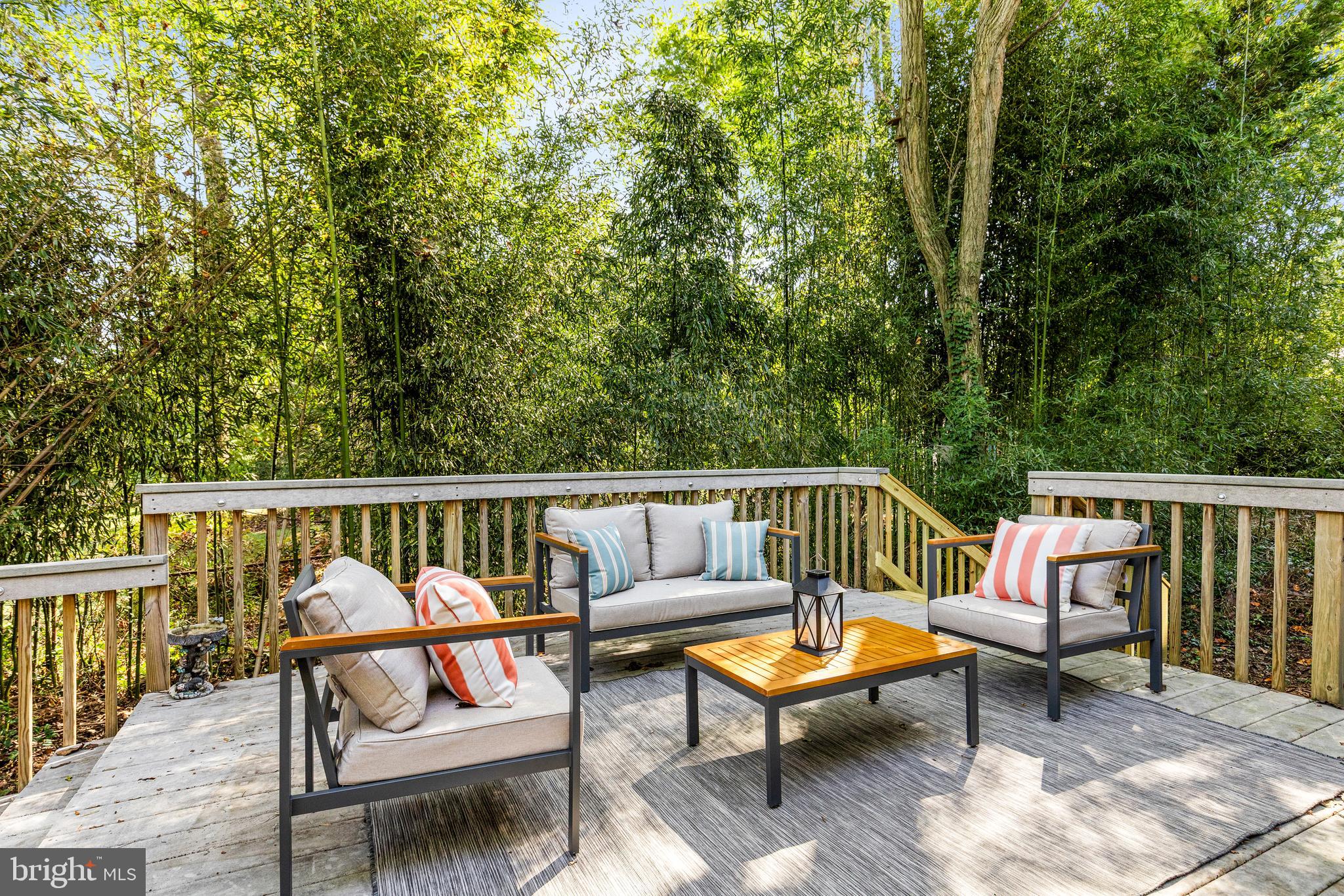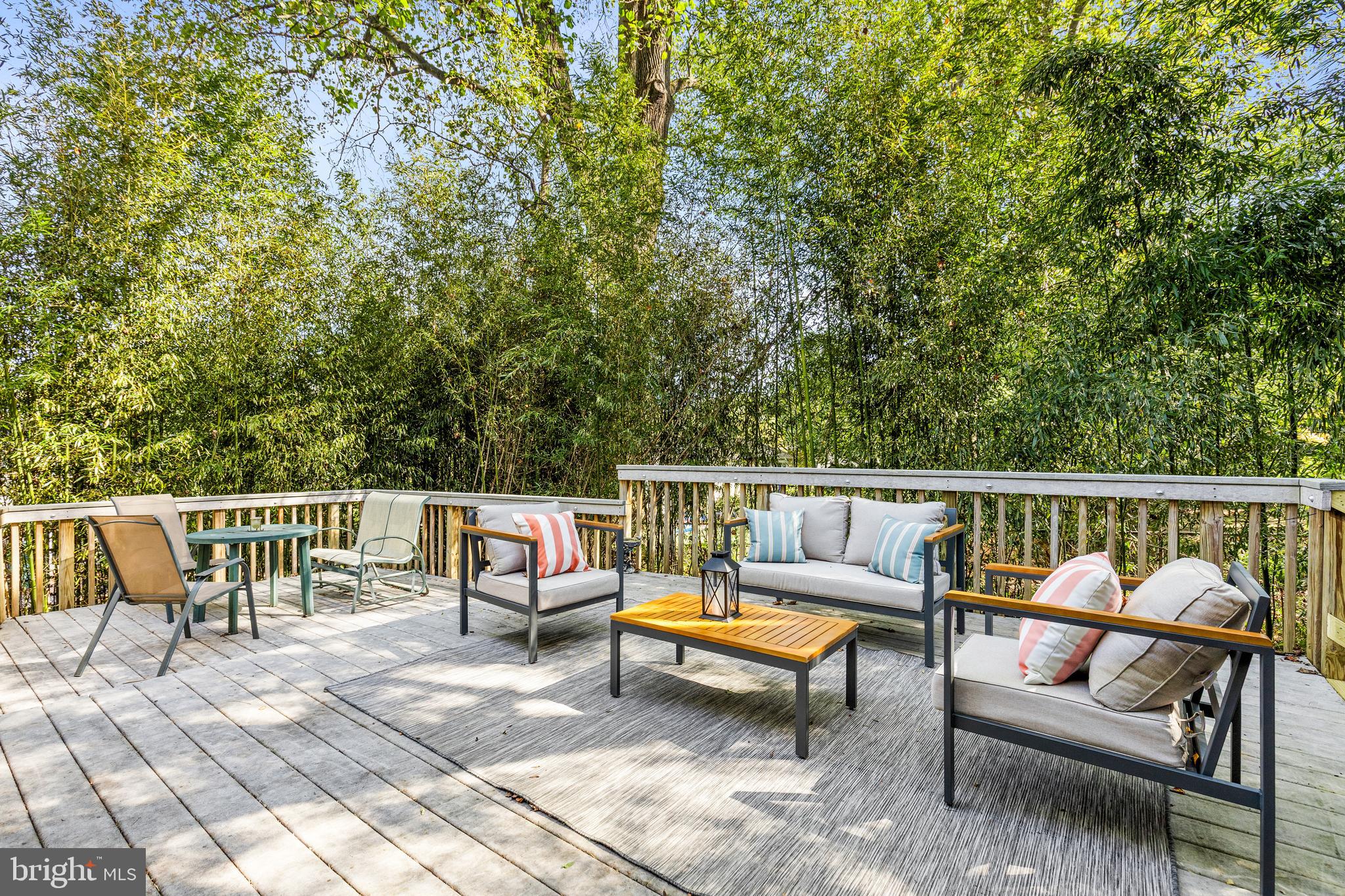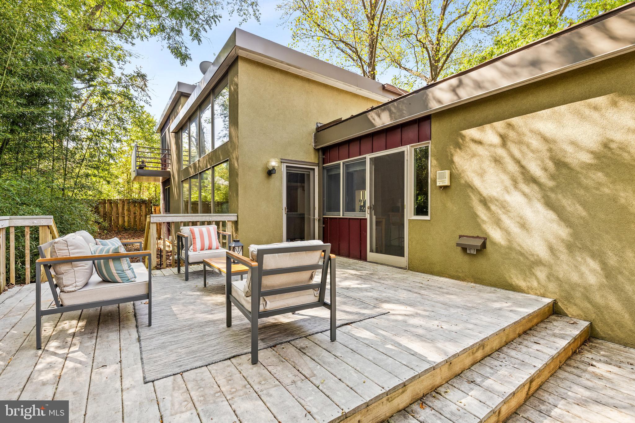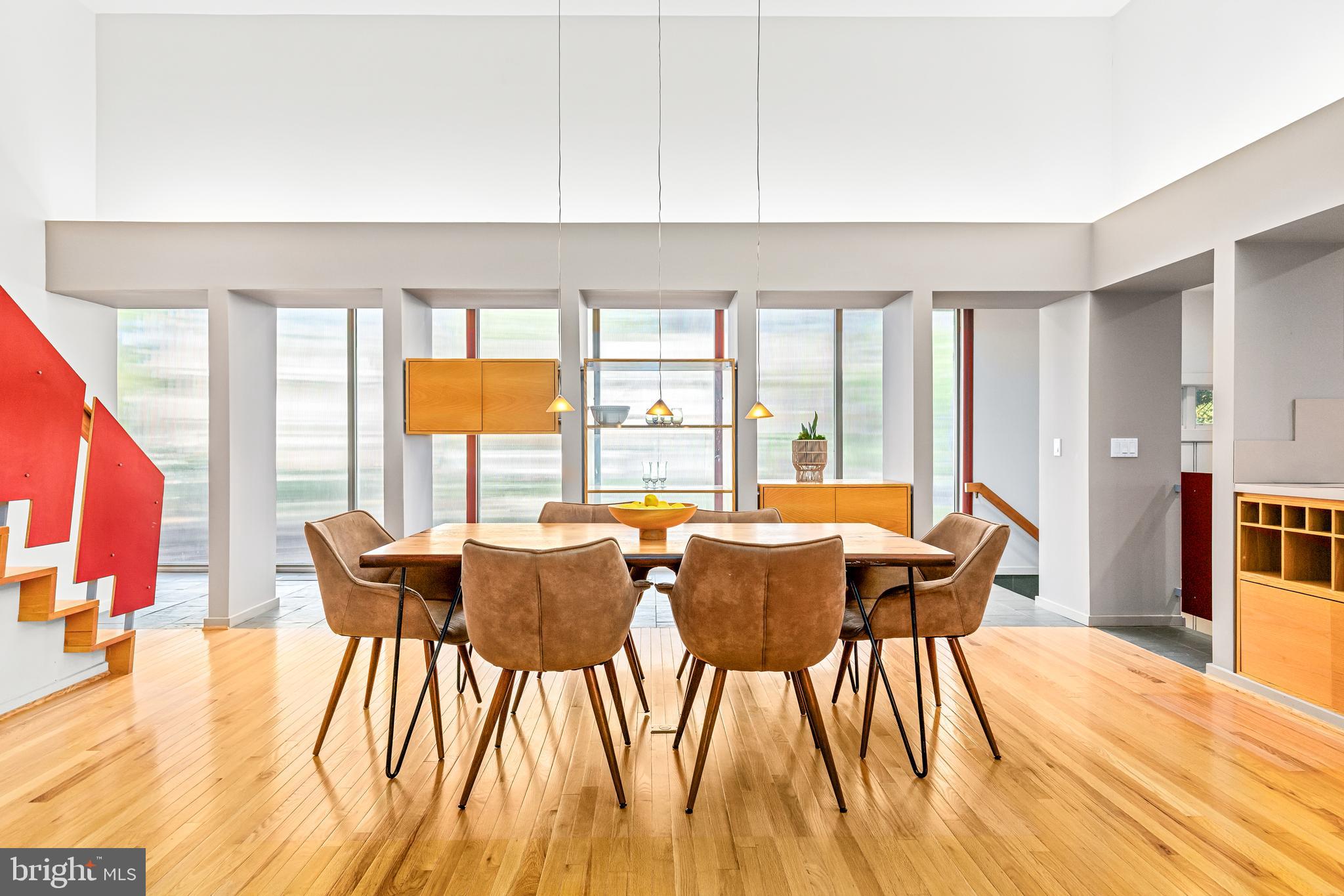 Set on an elevated lot in the City of Rockville, the home retreats gracefully from the street beneath a canopy of mature trees. A dense bamboo screen wraps the backyard, forming a secluded sanctuary of dappled light and privacy. Echoes of mid-century modernism are present, yet the architecture is distinctly of its own time, centered around a soaring two-story volume that defines the home's living core.