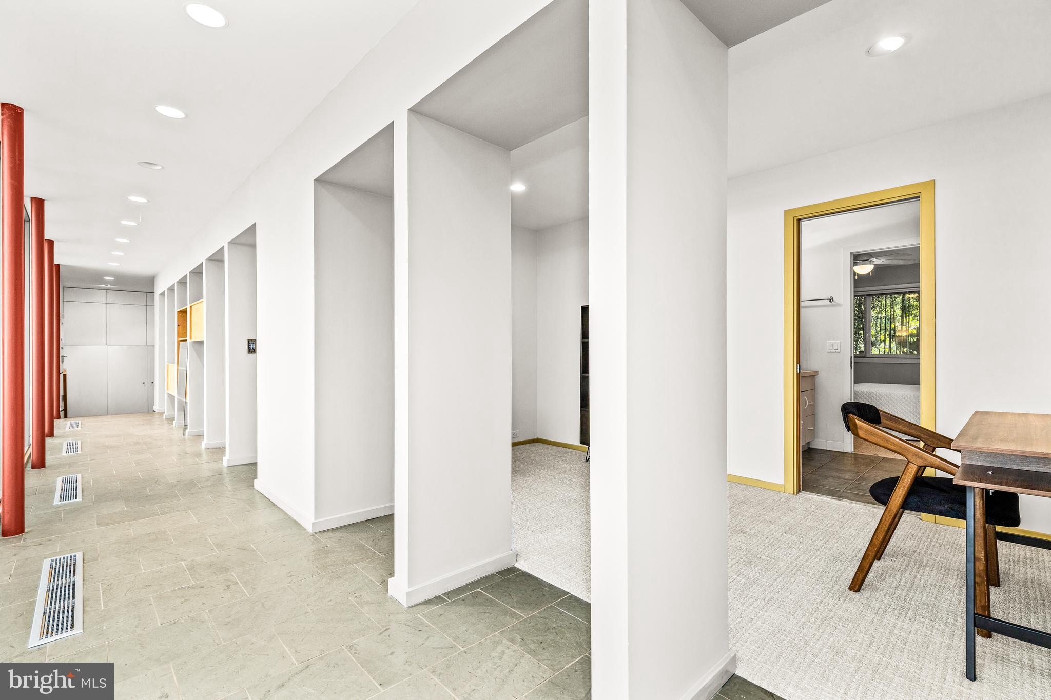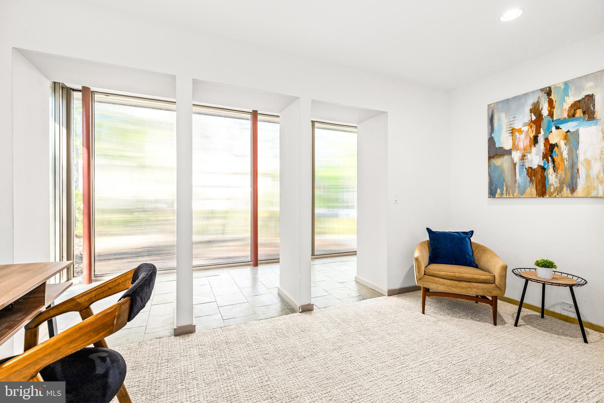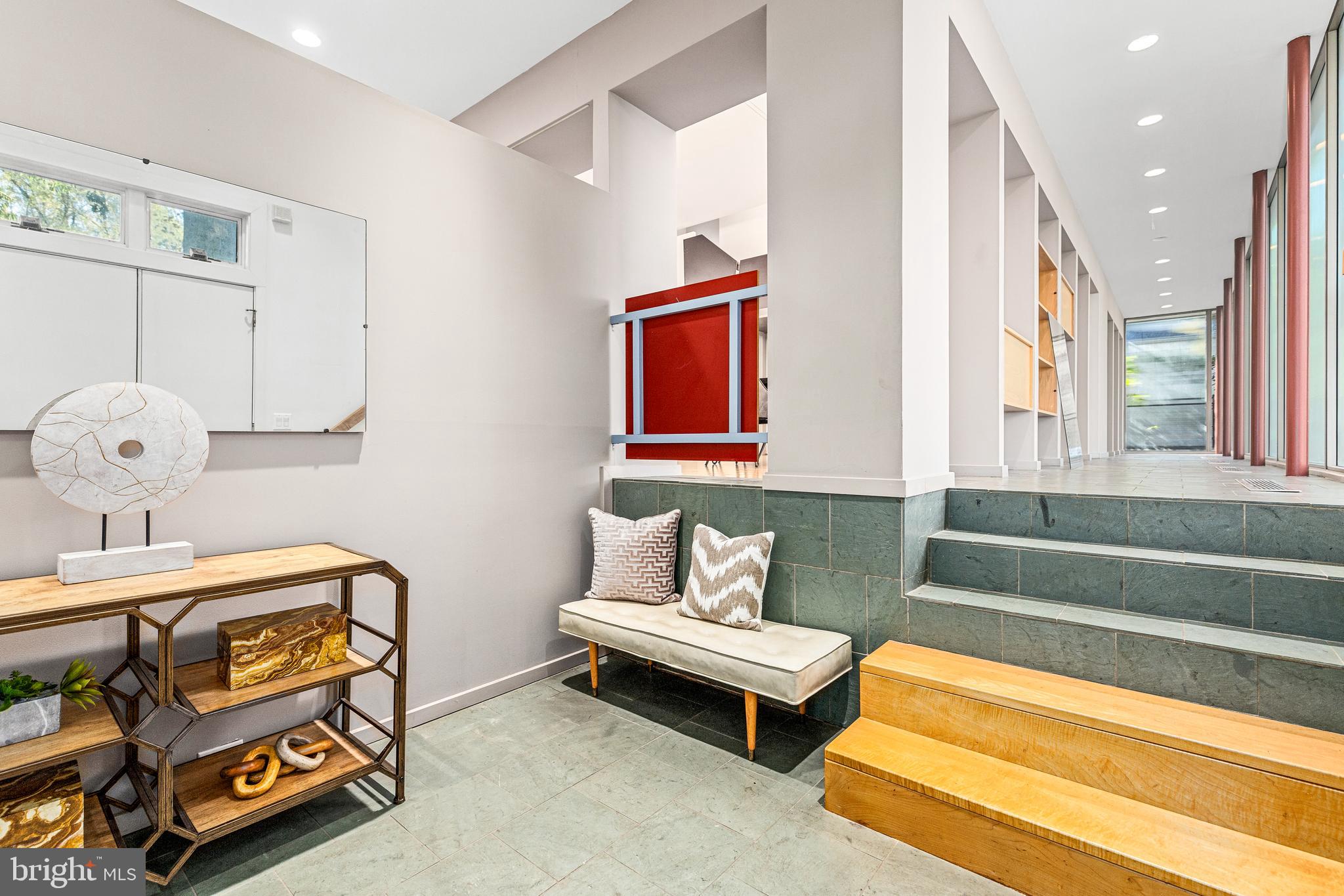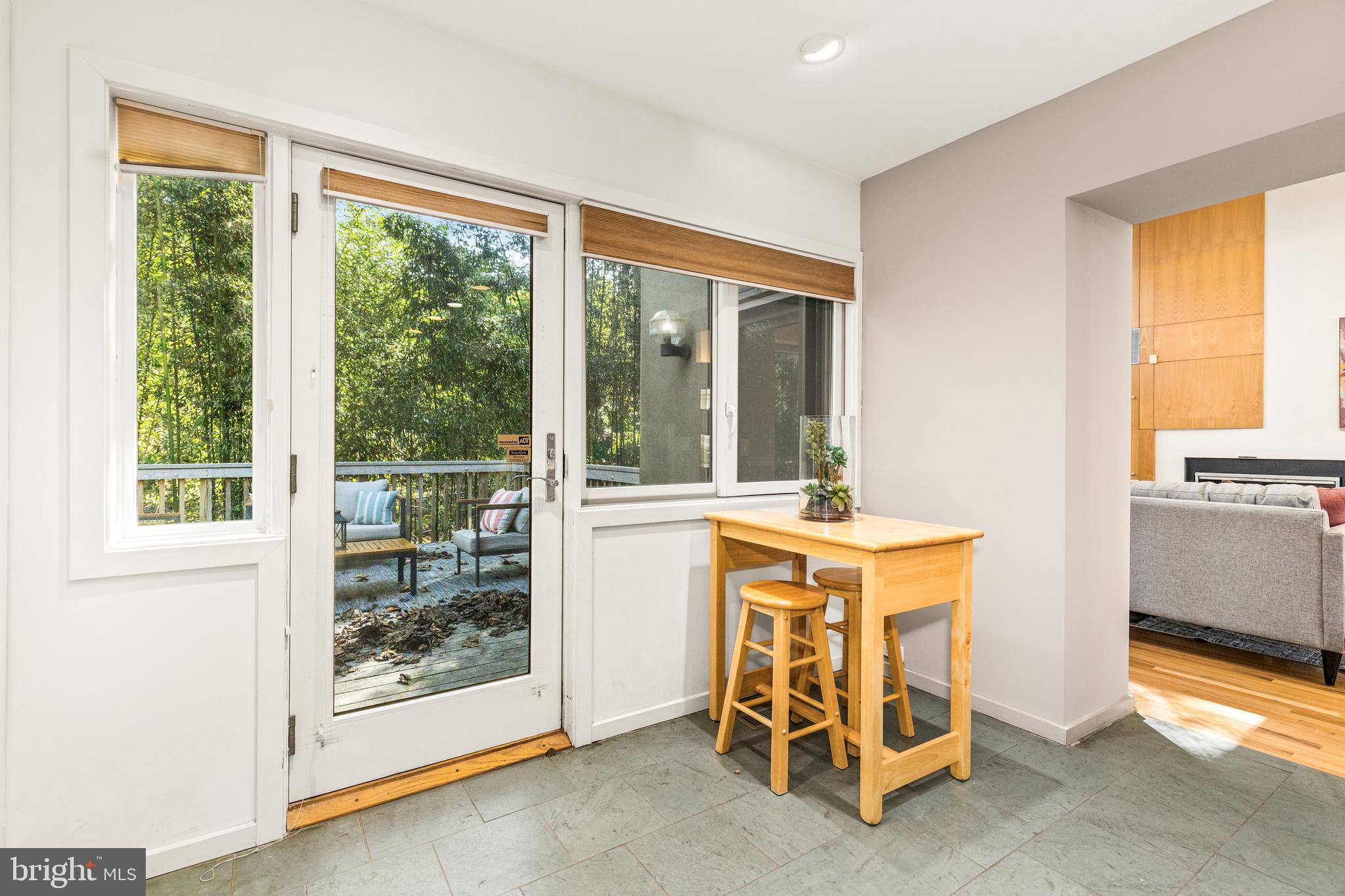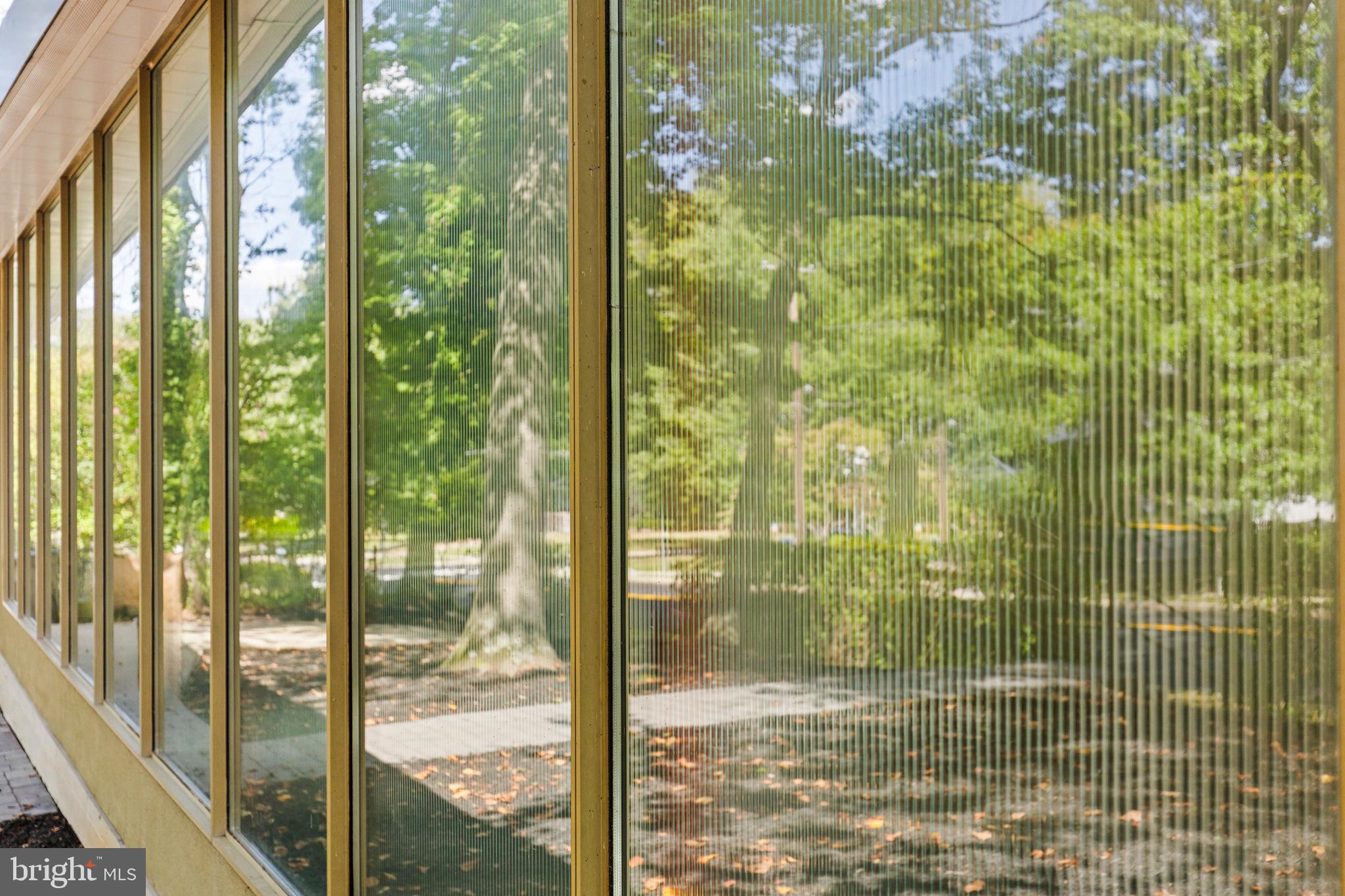 Set on an elevated lot in the City of Rockville, the home retreats gracefully from the street beneath a canopy of mature trees. A dense bamboo screen wraps the backyard, forming a secluded sanctuary of dappled light and privacy. Echoes of mid-century modernism are present, yet the architecture is distinctly of its own time, centered around a soaring two-story volume that defines the home's living core.