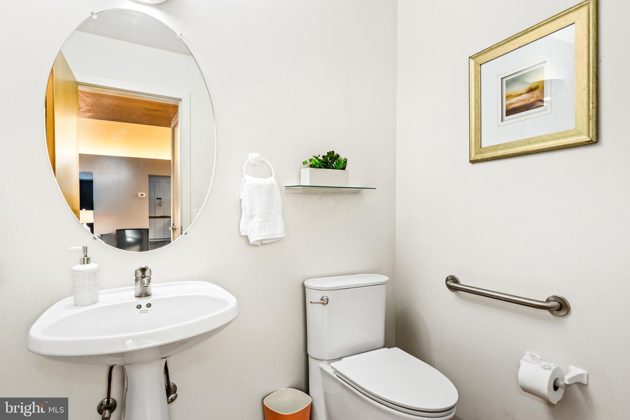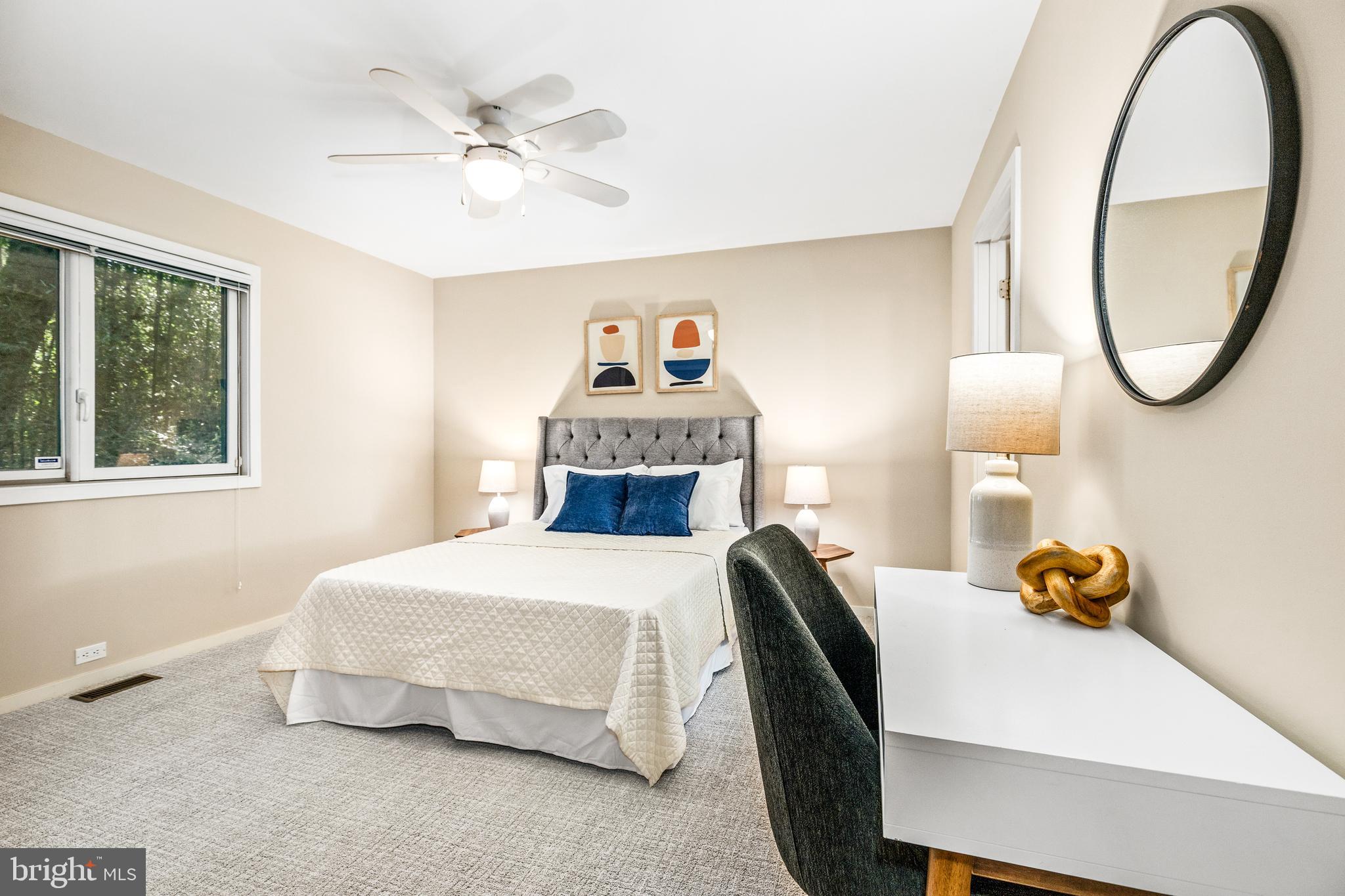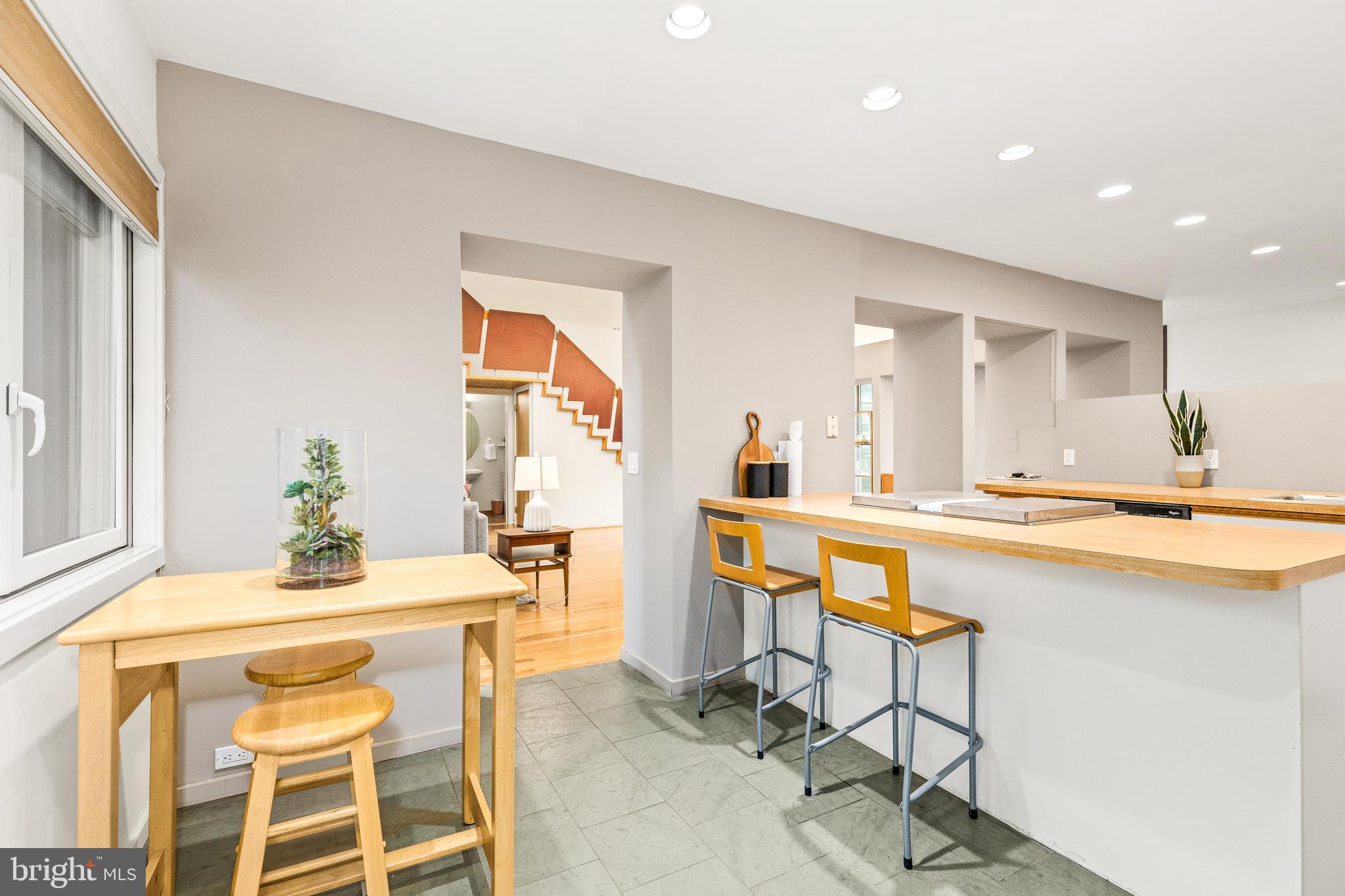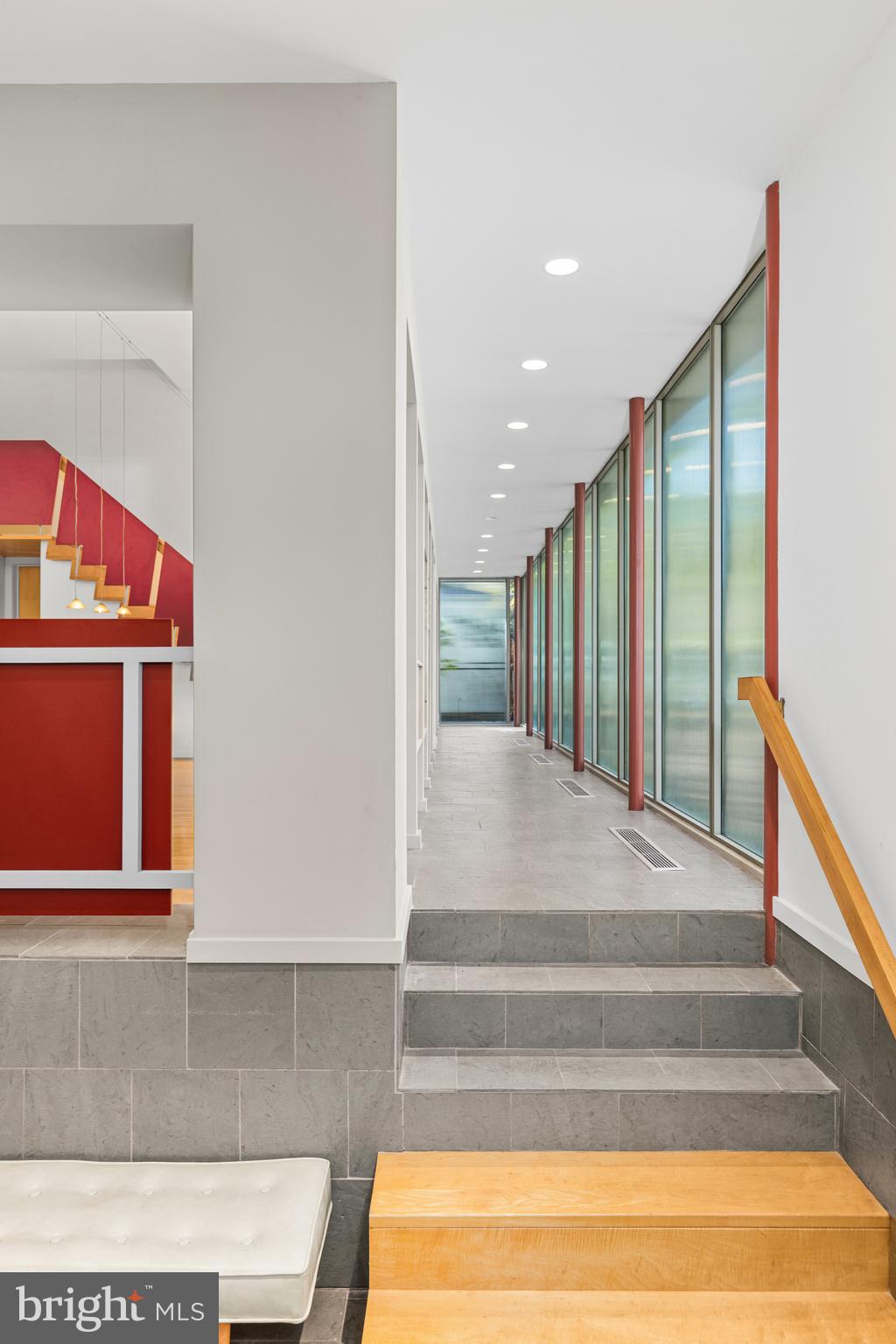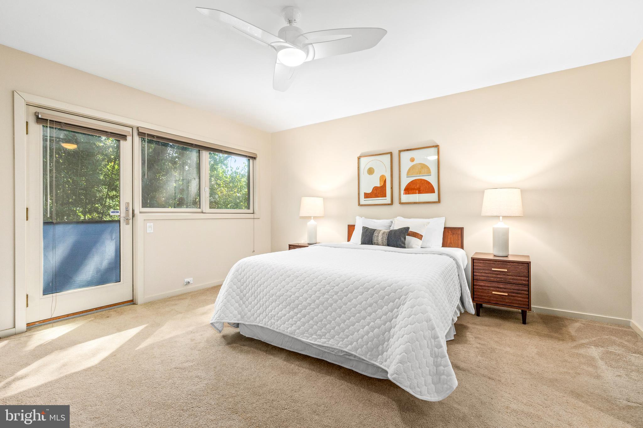 Set on an elevated lot in the City of Rockville, the home retreats gracefully from the street beneath a canopy of mature trees. A dense bamboo screen wraps the backyard, forming a secluded sanctuary of dappled light and privacy. Echoes of mid-century modernism are present, yet the architecture is distinctly of its own time, centered around a soaring two-story volume that defines the home's living core.