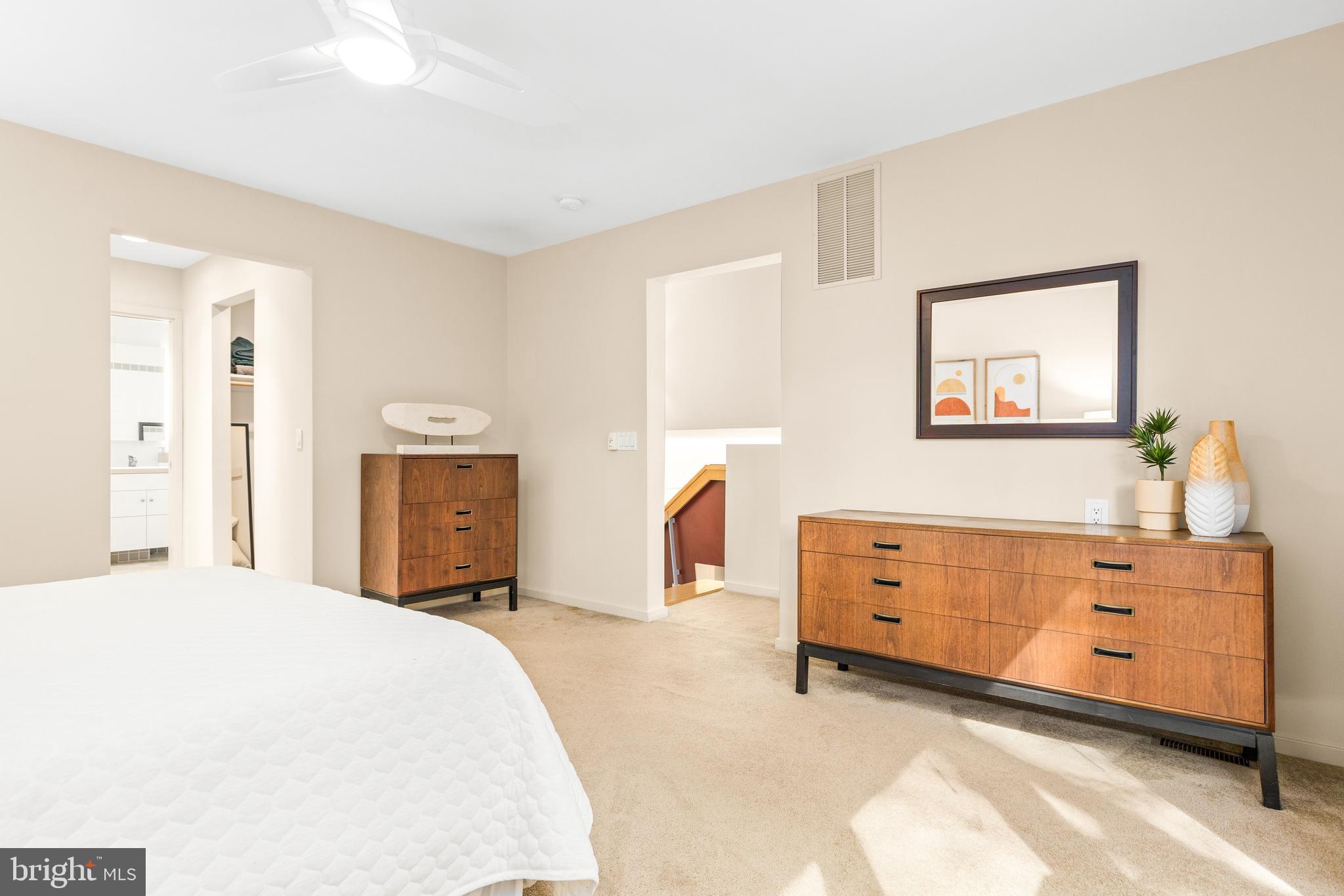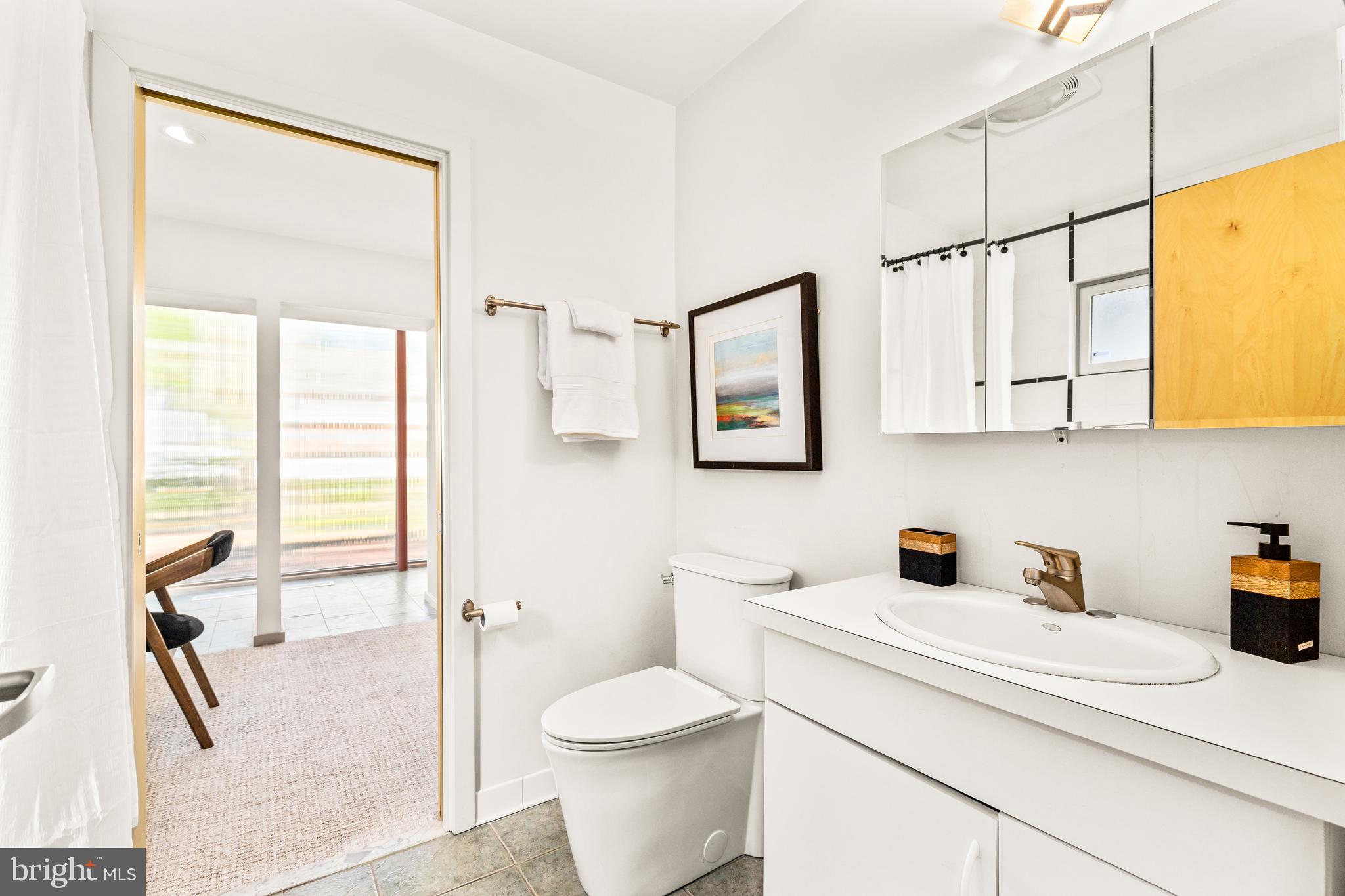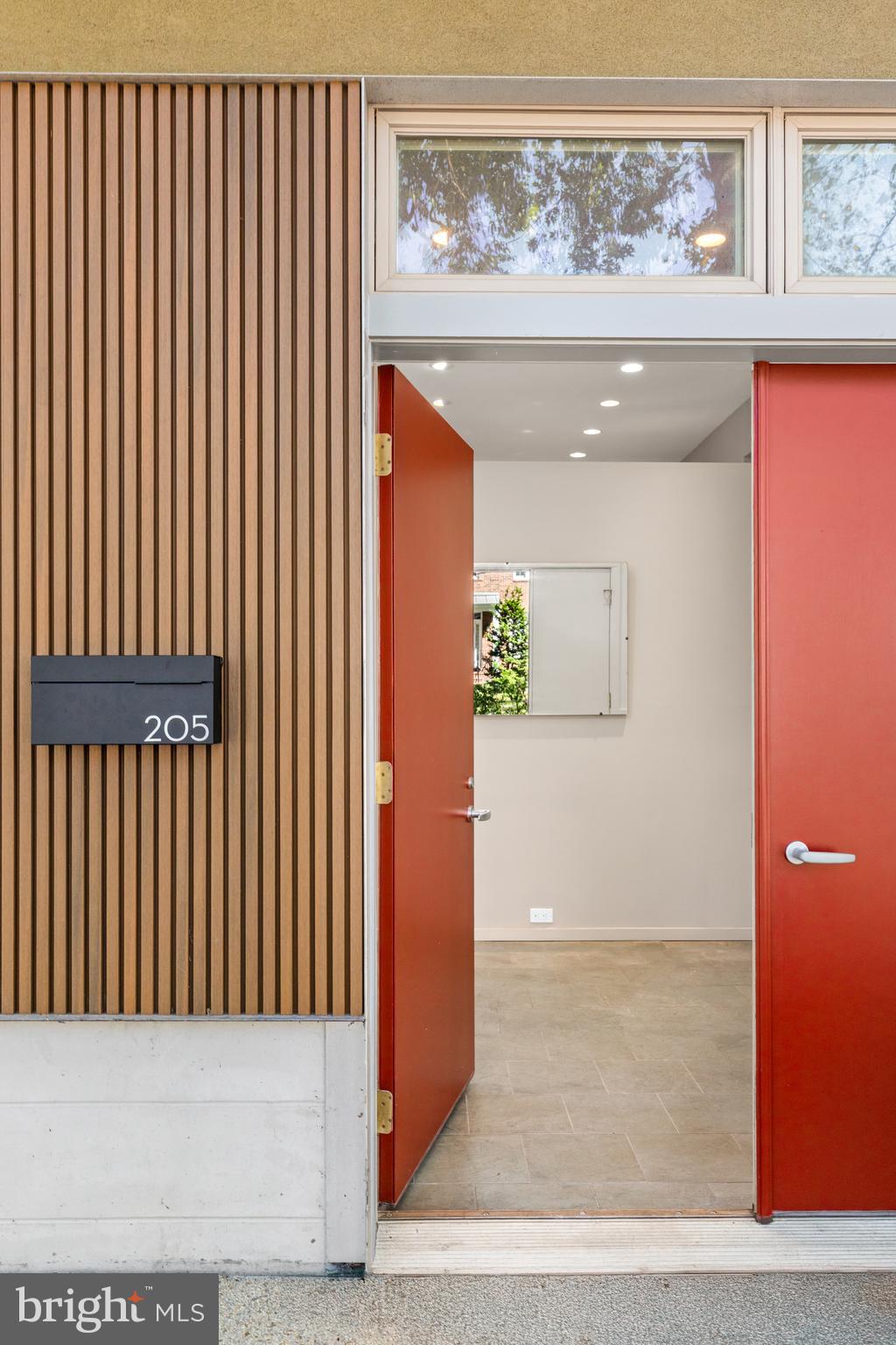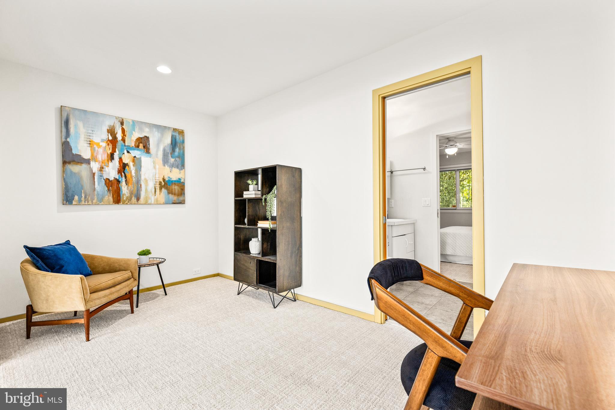 Set on an elevated lot in the City of Rockville, the home retreats gracefully from the street beneath a canopy of mature trees. A dense bamboo screen wraps the backyard, forming a secluded sanctuary of dappled light and privacy. Echoes of mid-century modernism are present, yet the architecture is distinctly of its own time, centered around a soaring two-story volume that defines the home's living core.