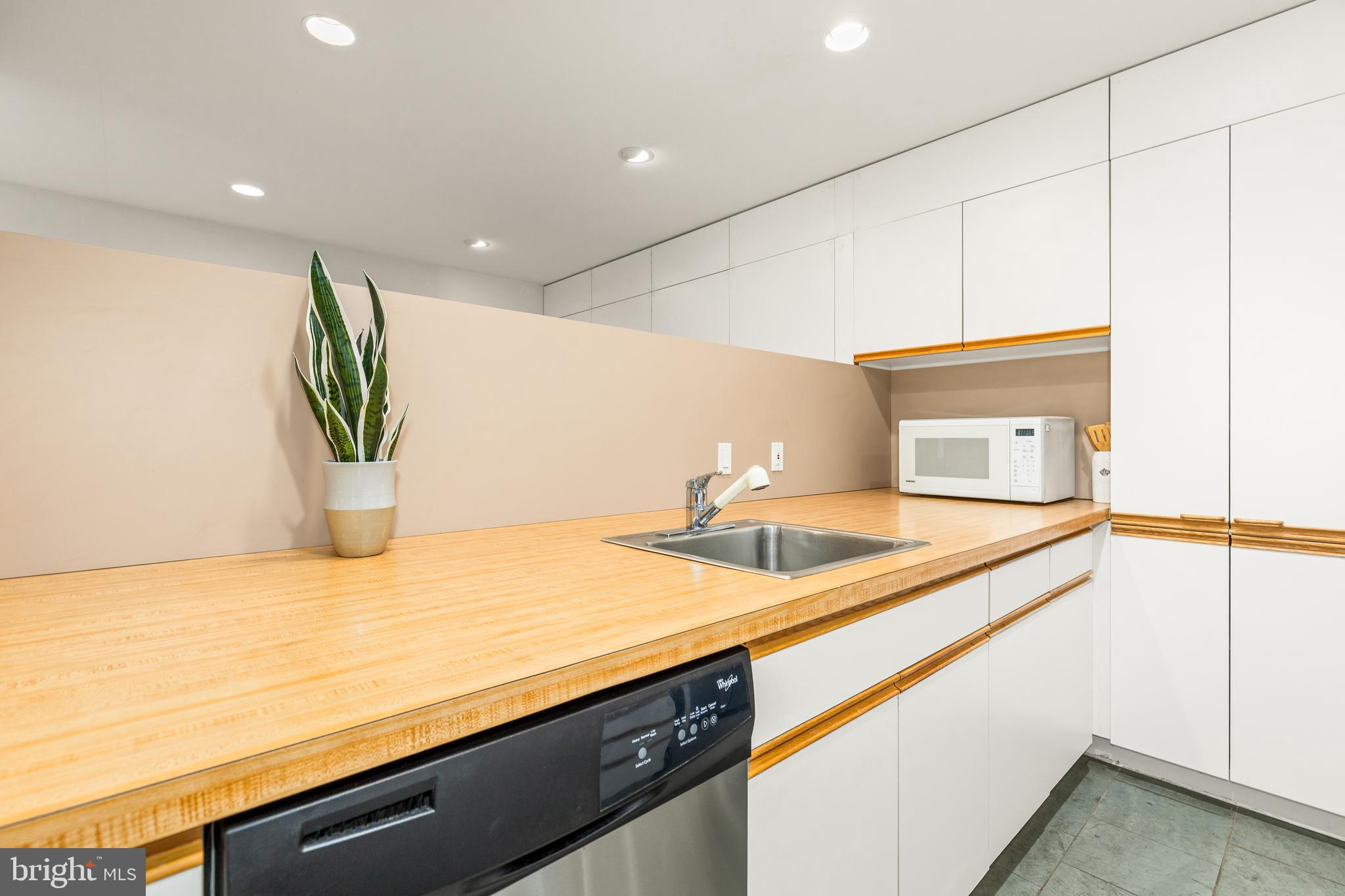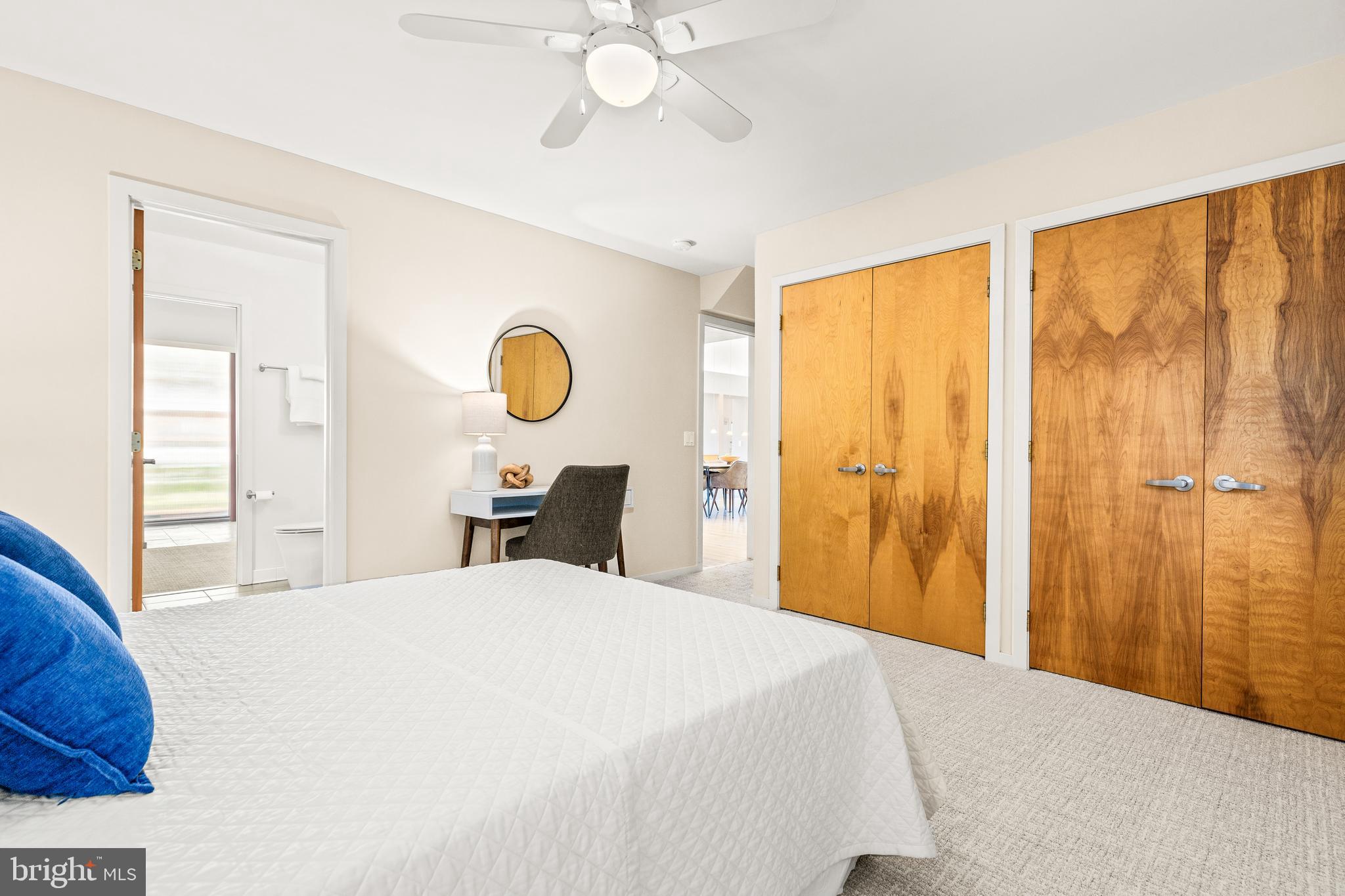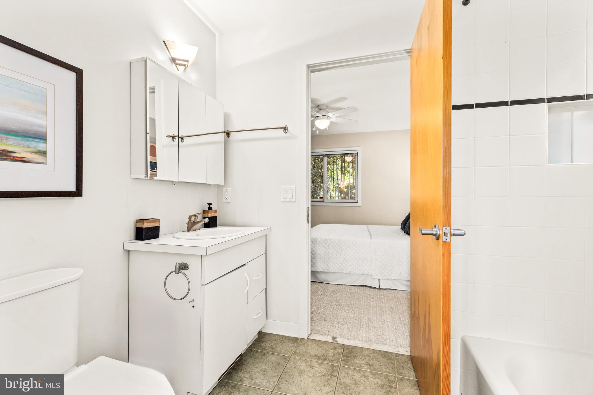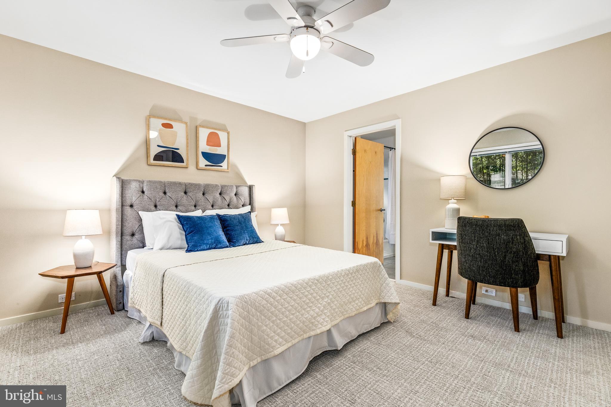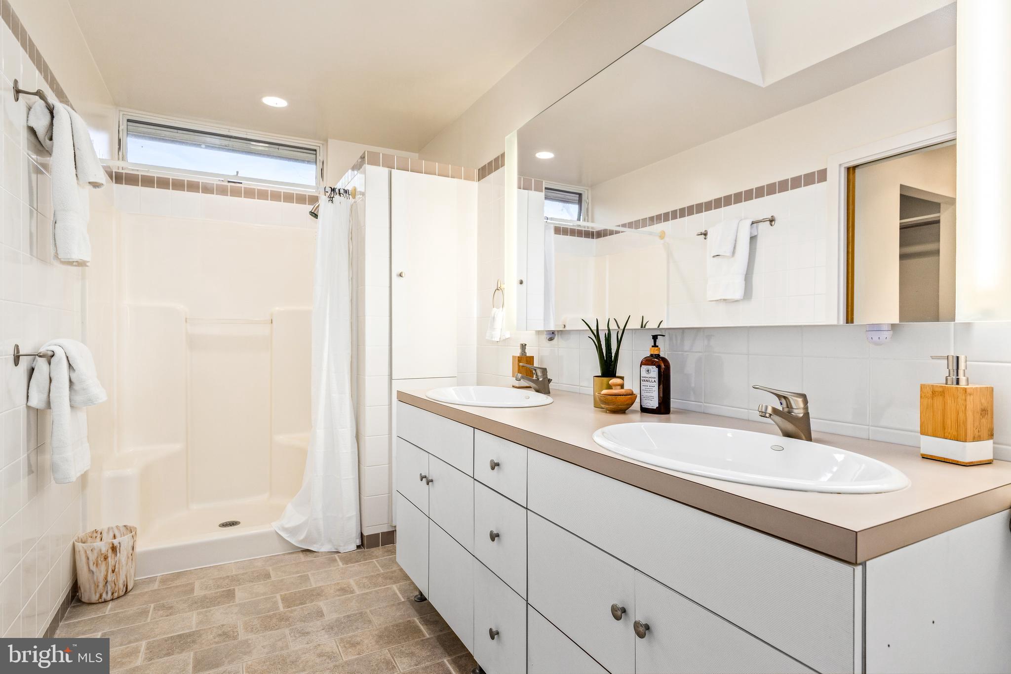 Set on an elevated lot in the City of Rockville, the home retreats gracefully from the street beneath a canopy of mature trees. A dense bamboo screen wraps the backyard, forming a secluded sanctuary of dappled light and privacy. Echoes of mid-century modernism are present, yet the architecture is distinctly of its own time, centered around a soaring two-story volume that defines the home's living core.