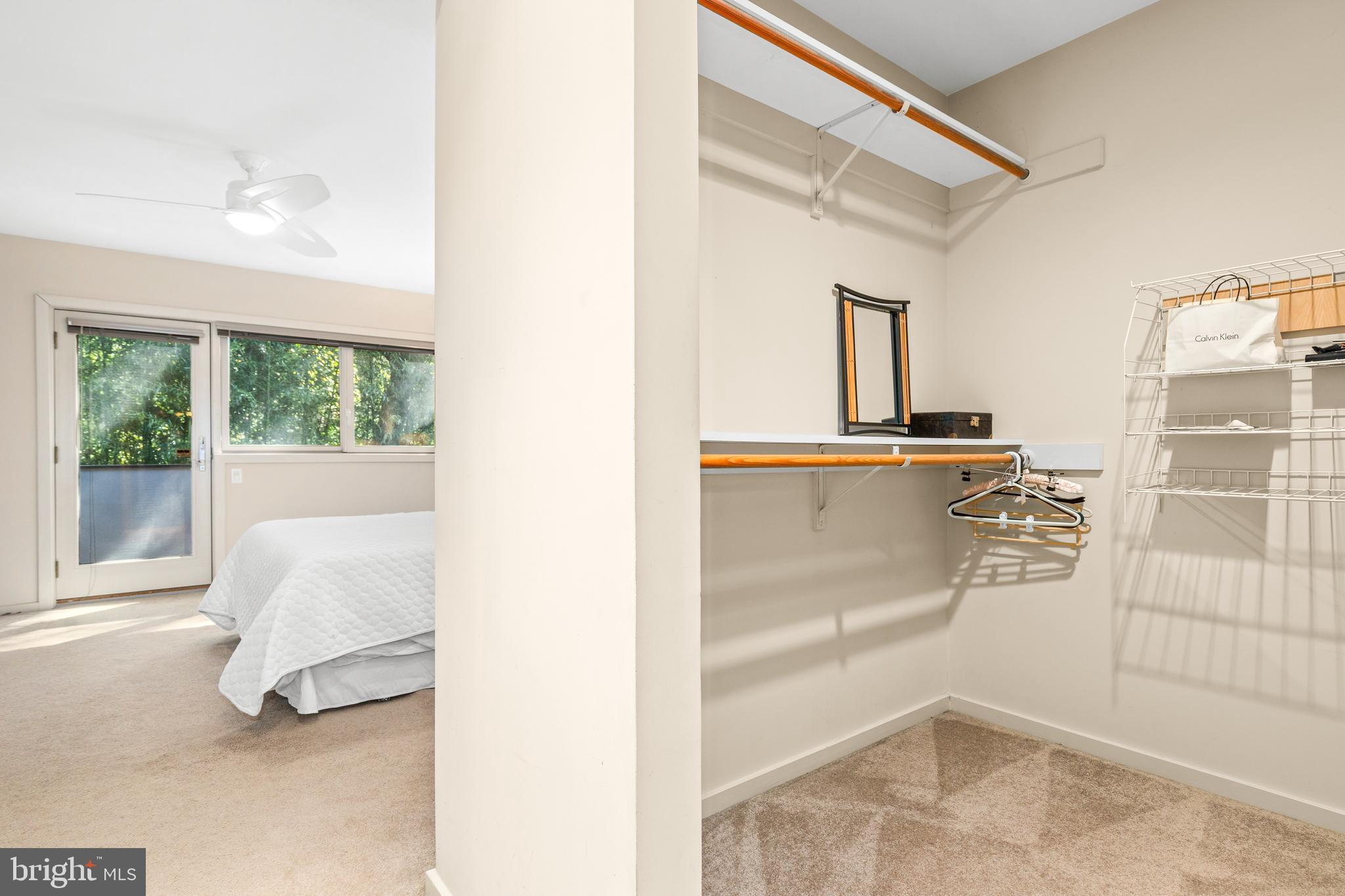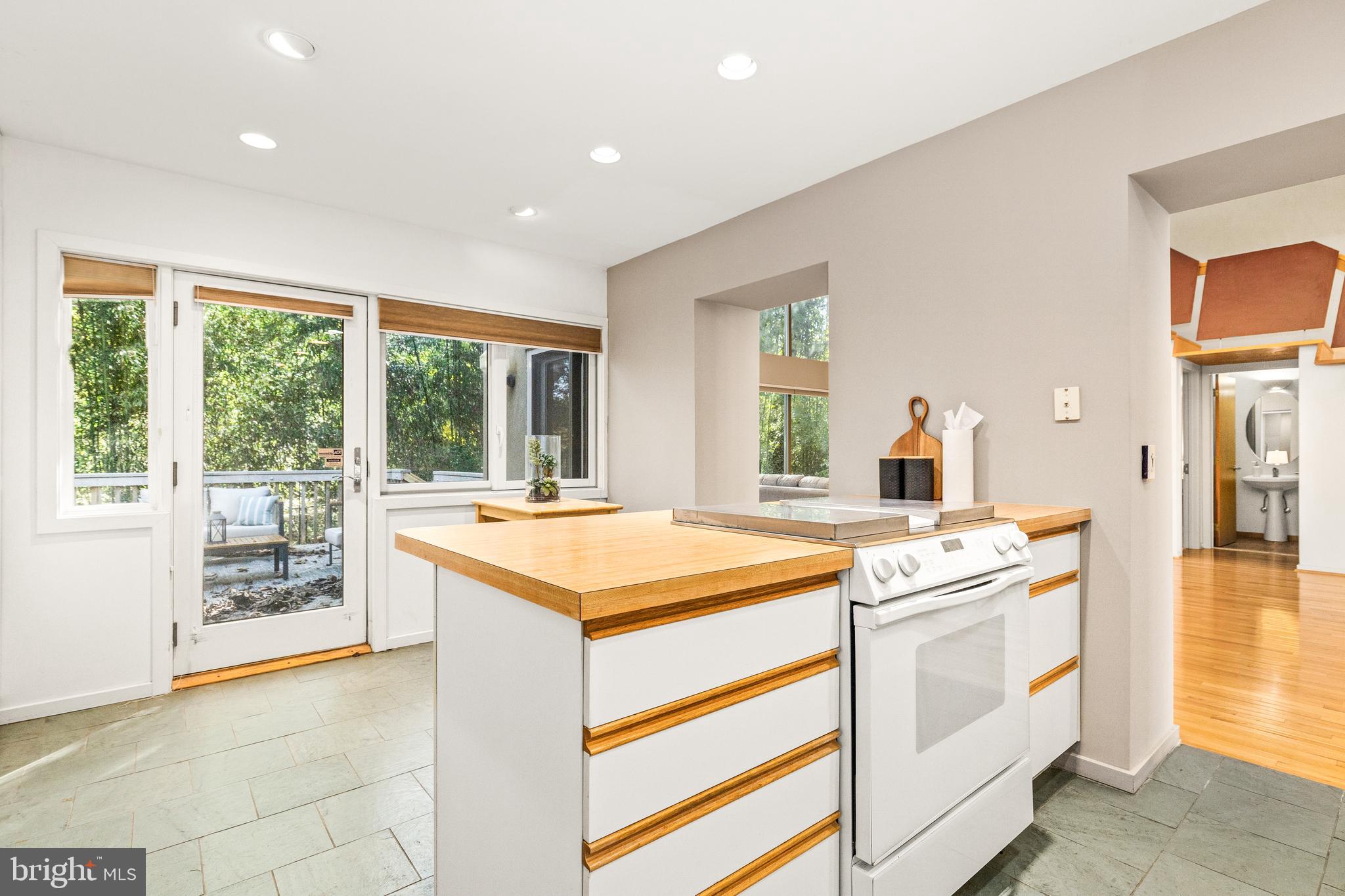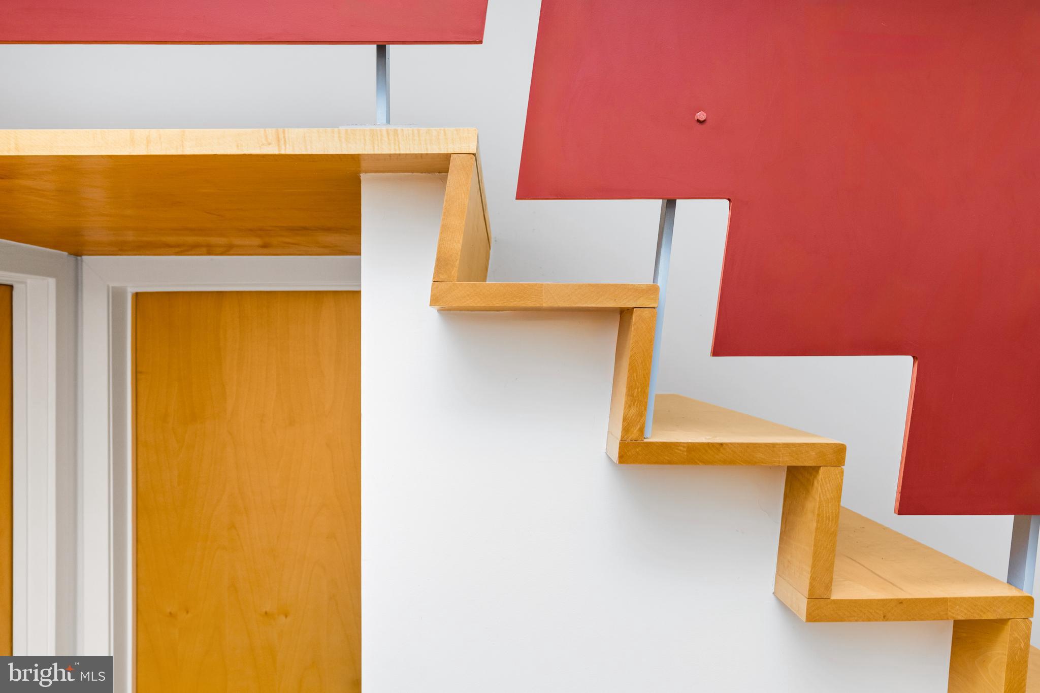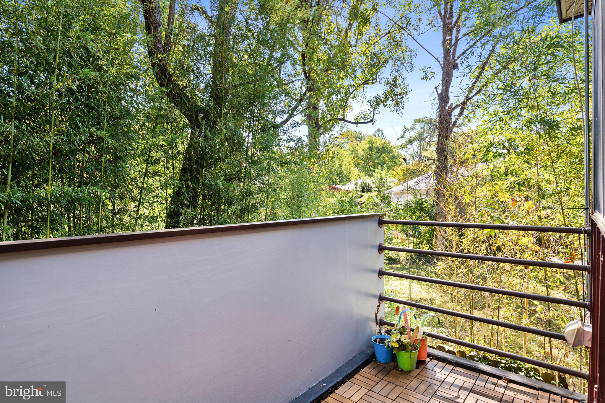 The upper level is devoted to a private primary suite, suspended within the home's open volume and framed by treetop views. Dual walk-in closets and a secluded balcony extend the sense of calm and retreat. The kitchen, a study in functional modernism, features wall-to-wall built-ins and a striking visual connection to the foyer below. It is a generous, light-filled space with a breakfast area and direct access to a large deck that invites outdoor dining and quiet mornings among the trees.