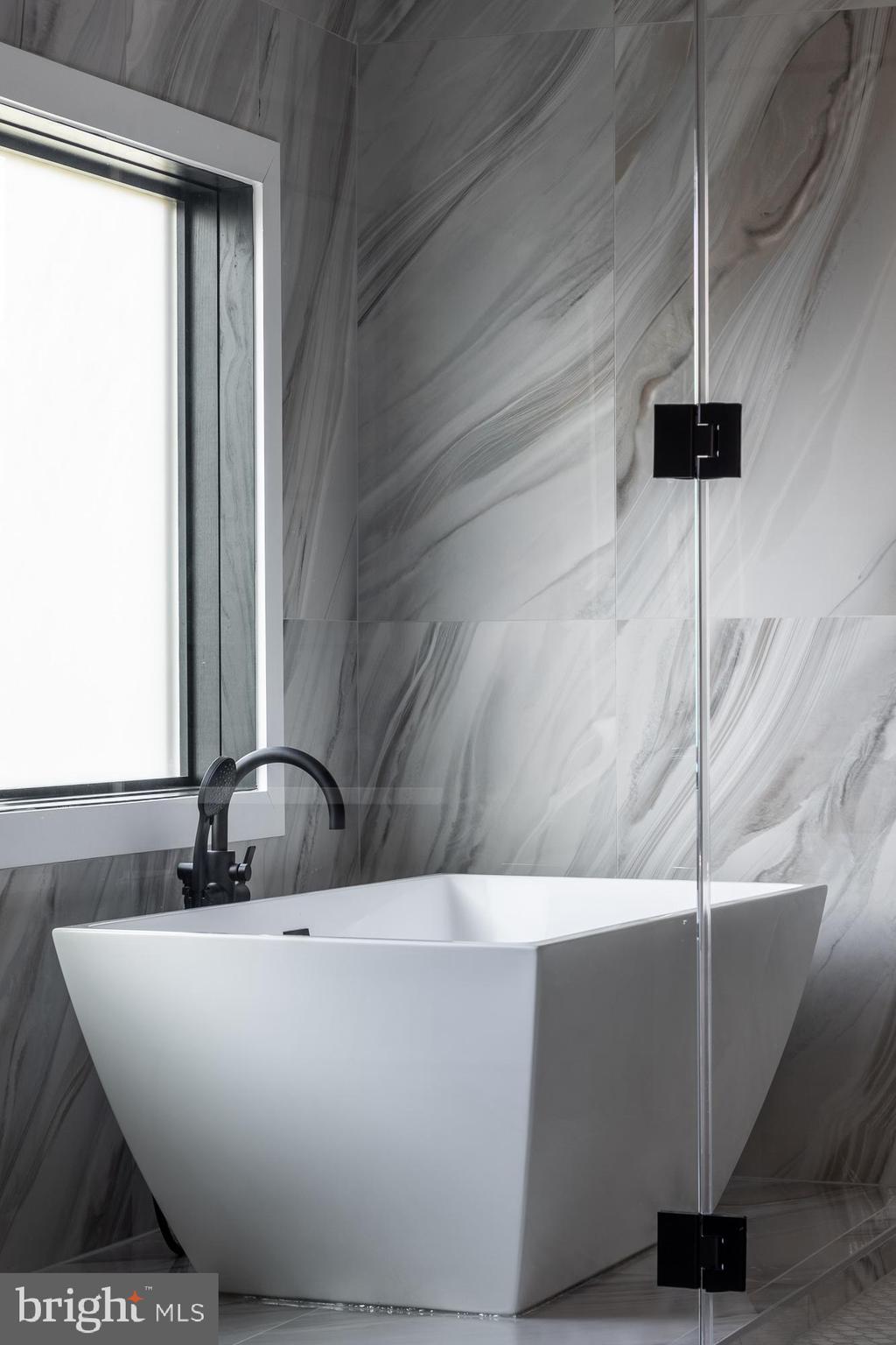The primary suite opens to a large private terrace through double glass doors and windows, all protected by automated shades. A private bar sits within the suite. The spa-style bathroom offers an oversized walk-in shower, freestanding tub, and heated floors.